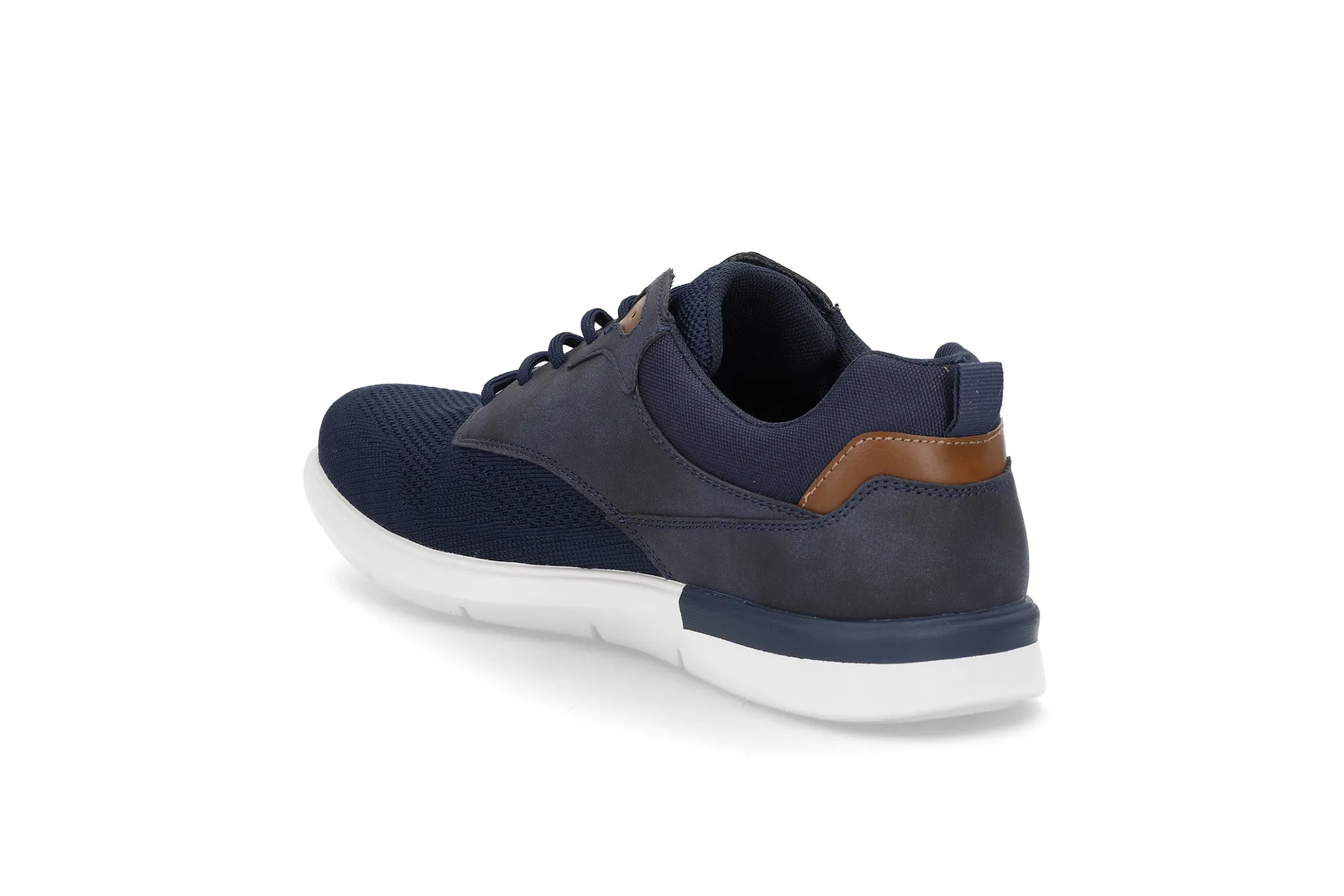Urbane fritidssko i lett og luftig tekstil. Skoene er mørkeblå med brune detaljer og har syntet og tekstilmateriale i kombinasjon. Den hvite yttersålen er lett og fleksibel.