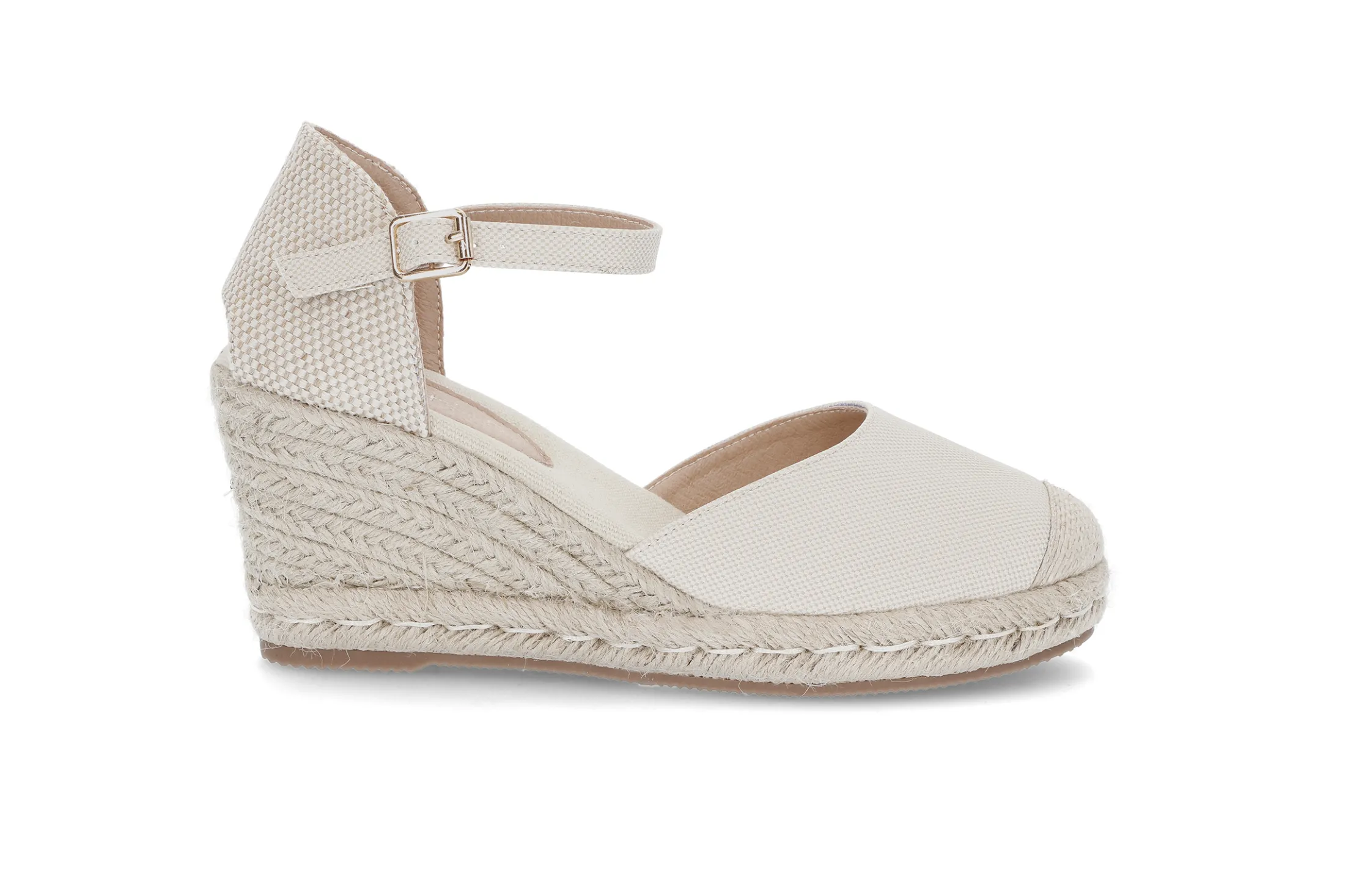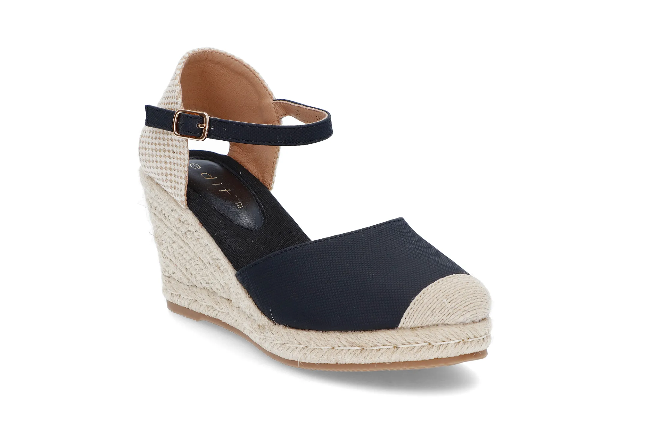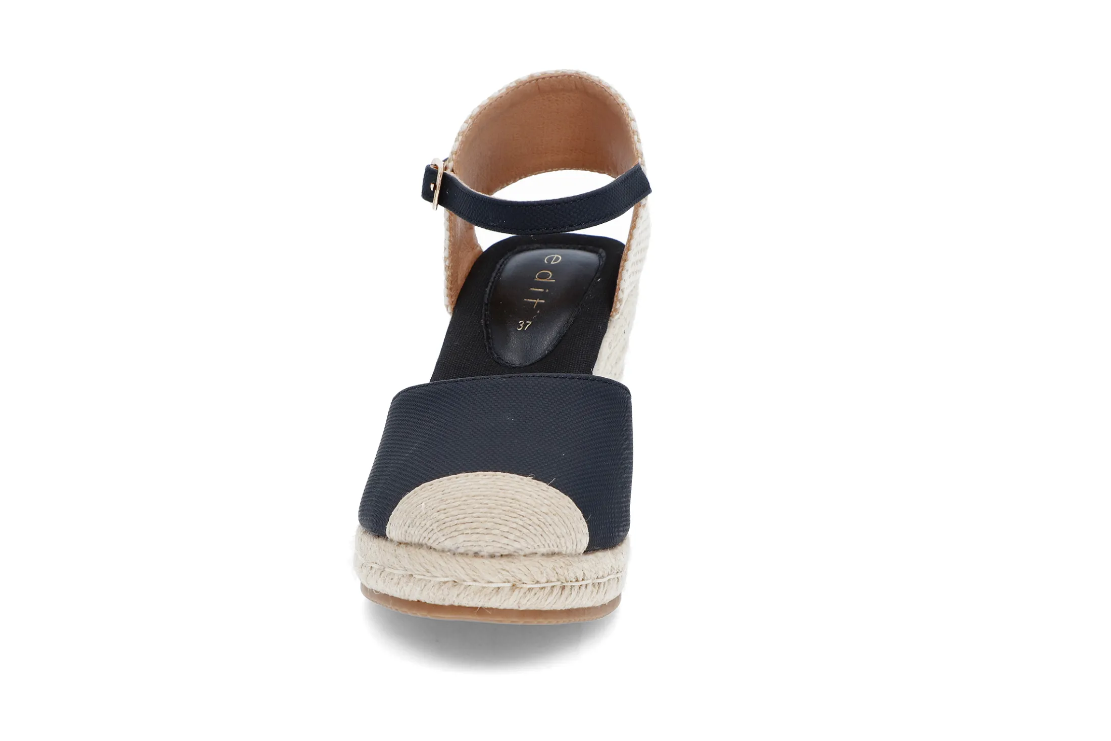 Espadrillos fra Edit på en myk og behagelig kile såle. Espadrillosene har en justerbar ankelrem og en 8 cm høy kilehæl dekket med jutebånd.