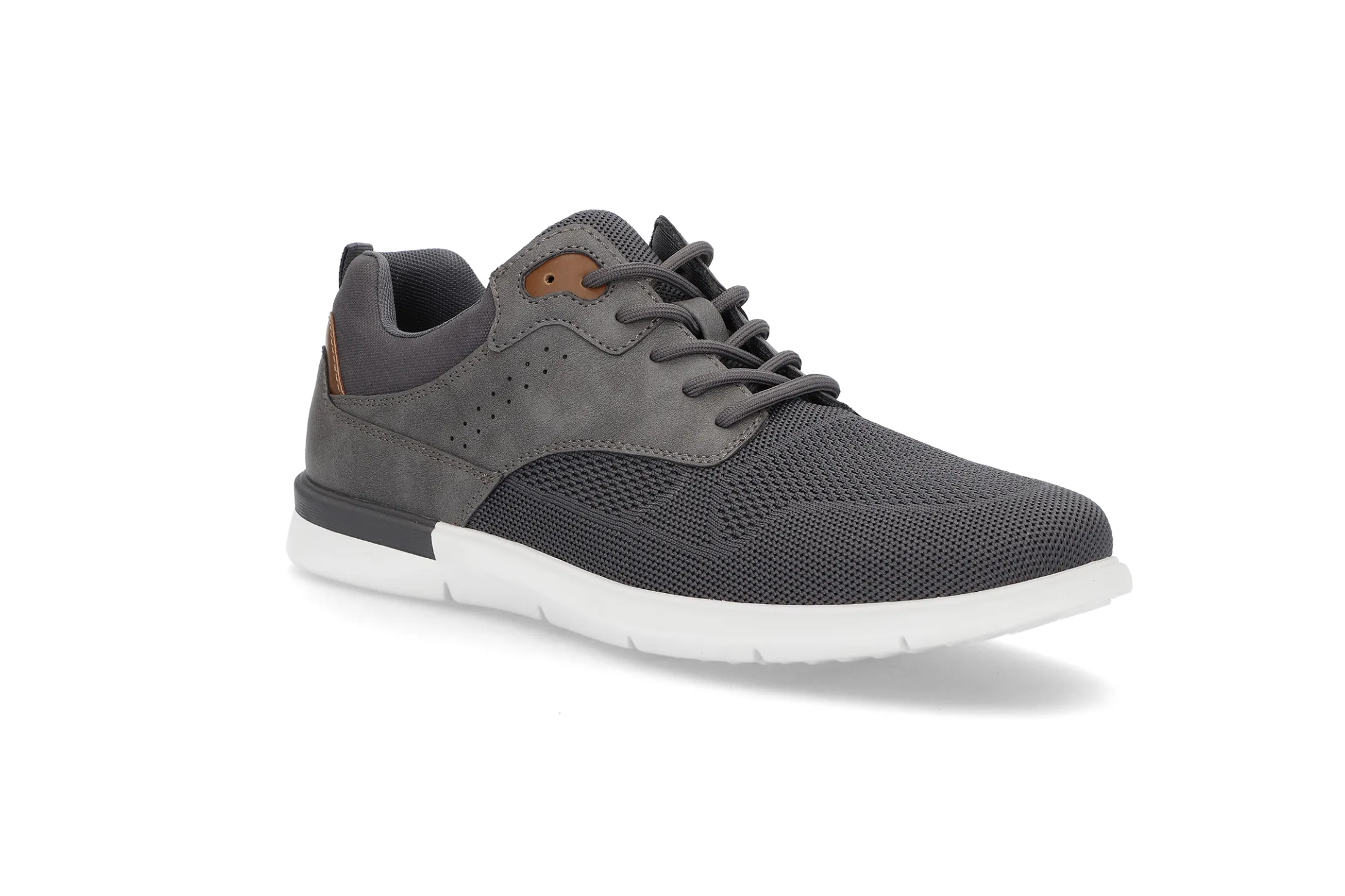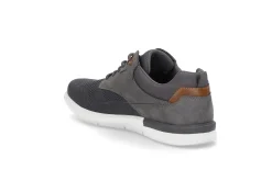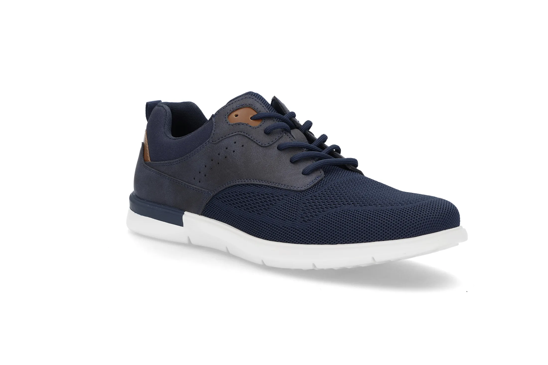 Urbane fritidssko i lett og luftig tekstil. Skoene er mørkeblå med brune detaljer og har syntet og tekstilmateriale i kombinasjon. Den hvite yttersålen er lett og fleksibel.
